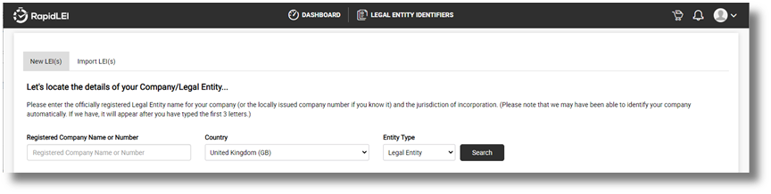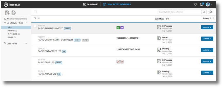 RapidLEI uses enhanced data gathering techniques to help make the process simple, but there may be several reasons why a business registry is offline, or an entity cannot be located. If this happens, our team will take over and during this time the LEI will move to ‘In Progress’. Once we’ve moved things forward the LEI will again be ‘Pending’ on confirmation or data from you. Let’s look at the ‘NEW LEI(s)’ workflow first…