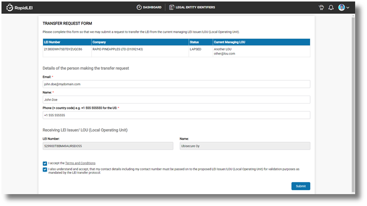 Once you have processed payment to import the LEI, you’ll be presented with the Transfer Request Form. This is where you highlight the details of the authority requesting the import. Please note that we are required to take slightly more detailed information such as phone number and email of the person making the request. These should ideally match the empowered individual who usually signs LEI terms of service. If not, then LoA’s need to be uploaded. These additional details are mandated by the GLEIF, as is the content of the transfer form.