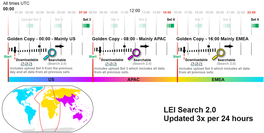 Rapid LEI publishes 9 times per day. The 3rd set at 07:00am is used at 08:00am by GLEIF to build their ‘Golden Copy’ in roughly 30 minutes and between 2 and 5 hours later LEIs will appear on Search 2.0.