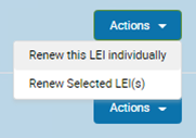Each individual blue ‘Actions’ button allows all LEIs, or a single LEI to be renewed. Alternatively to renew all at once, please select the black ‘Renew Selected LEI(s).