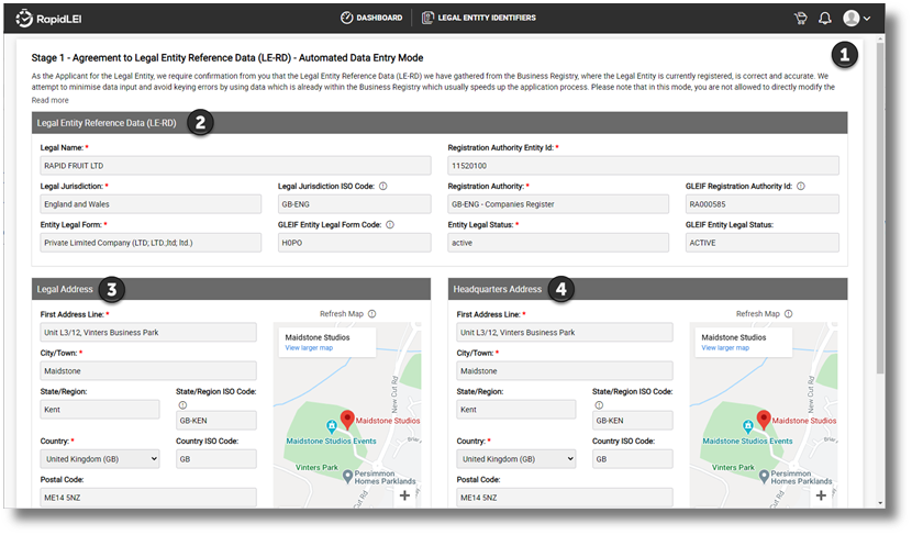 The first stage of the process identifies the Legal Entity and allows you to confirm LE-RD (Legal Entity Reference Data). – In many cases we can obtain this in real time via a few characters.